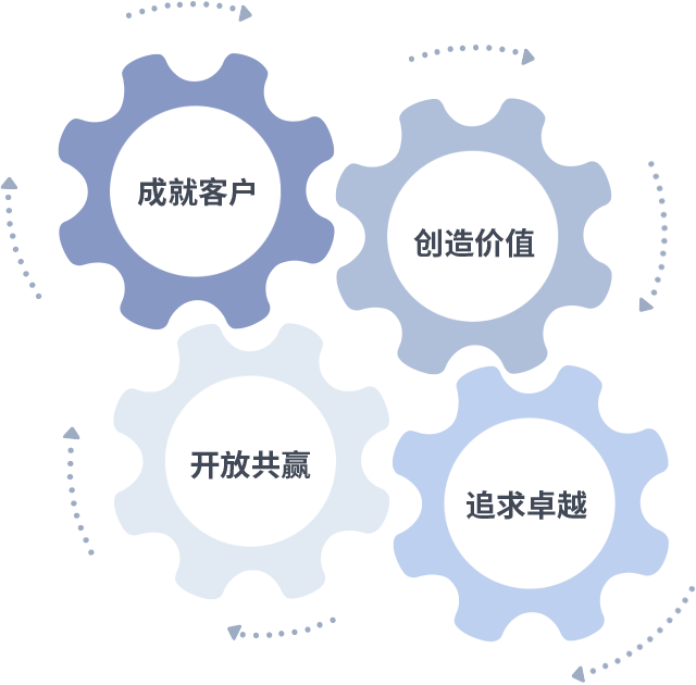 成就客户是一切决策的出发点,,,创造价值是衡量所有工作的标准,,,追求卓越是我们做事做人的态度,,开放共赢是我们的格局也是最终的结果。。。价值观的齿轮环环相扣,,,推动着组织里的每个人不断向前。。。。